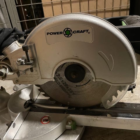 Elektrisk kap-/geringssav i ukendt mærke. Savens kabinet og bundplade er i blå plast/metal med rund drejeskive til geringssnit. Udstyret med håndtag bagpå og sidehåndtag for bedre styring under savning.