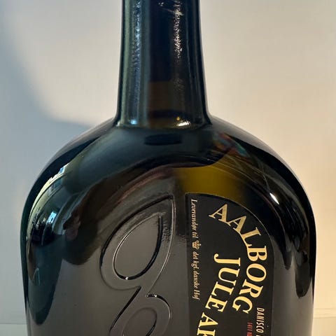 Aalborg Jule Akvavit i en karakteristisk flaske. Flasken har et unikt design og indeholder juleakvavit, en krydret snaps traditionelt nydt i juletiden.
