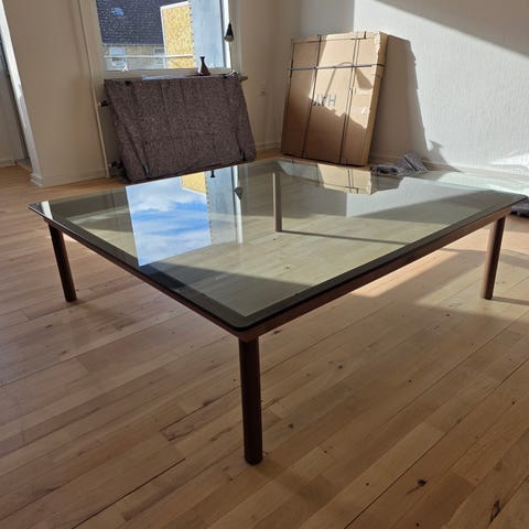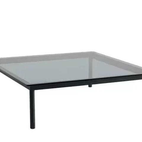 Nye, store sofaborde fra Hay: model Kofi, 120 x 120 cm. Valnød, gråtonet glas