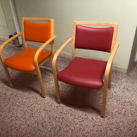 Stolen har et rundt polstret sæde i rødt stof samt slanke buede ben.,Afhentes i:,Røde Kors Ølby/Køge (259),Bemærk at mail, chat og beskeder ikke besvares, og varen skal købes på knappen "Gå til varen"