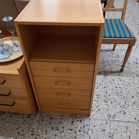 Fin lille kommode med4 skuffer med bølget form og metalhåndtag.,Afhentes i:,Røde Kors Ølby/Køge (259),Bemærk at mail, chat og beskeder ikke besvares, og varen skal købes på knappen "Gå til varen"