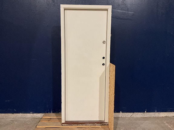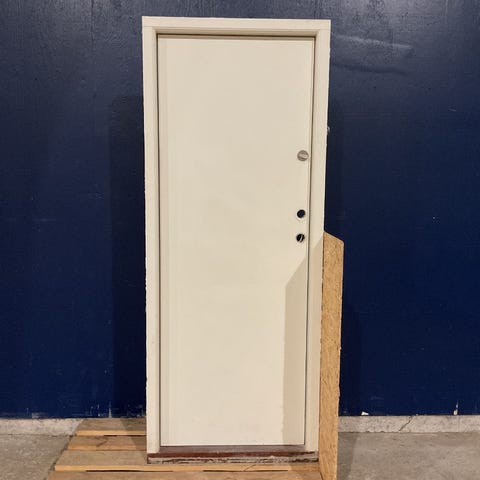 Brugt Sprosse Yderdør, Træ/træ, 2 lag glas, venstrehængt, indadgående, hårdttræsbundstykke, dørpumpe, mangler håndtag, lås, låsekasse og nøgle, mål: H212,8 B97,4 D14,5 Varenummer: 1765