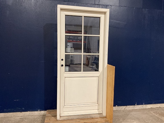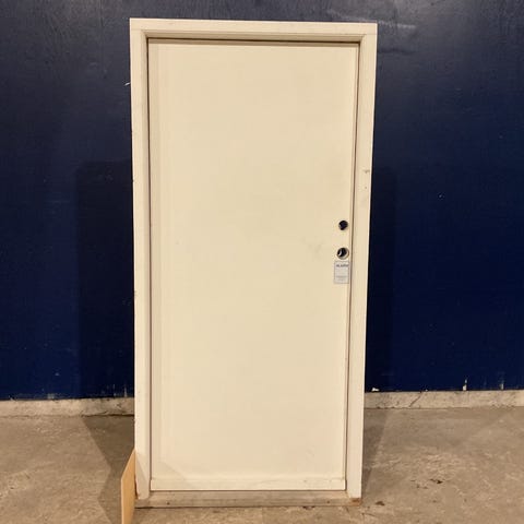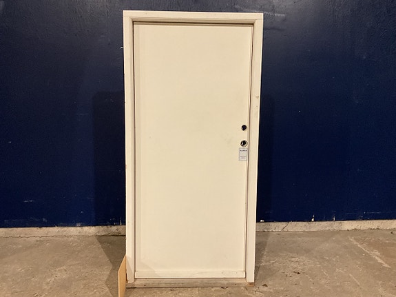 Brugt Yderdør, træ/træ, plade, højrehængt, indadgående, hårdttræsbundstykke, dørpumpe, mangler håndtag, lås, låsekasse og nøgle, mål: H197 B79 D11,6 Varenummer: 1766