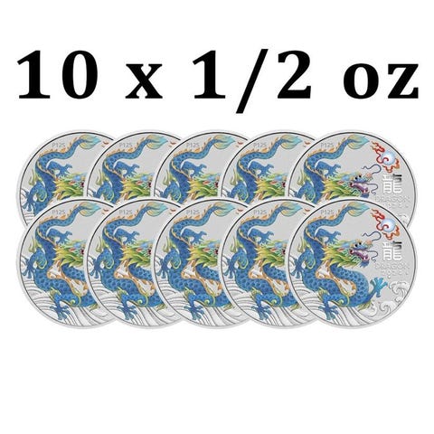 Fejr den mystiske tiltrækning ved dragen med 2024 1/2 oz sølv Australske Lunar Dragon Farvede mønter, endnu et udspil i Perths prestigefyldte Lunar Series III. Disse enestående sølvmønter har designs, der fanger essensen af den kunst, der ses på imperiale kinesiske drage-skærme, pakket ind i det velkendte Perth Lunars-program, kendt for sine