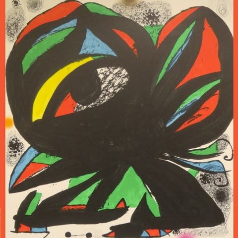 Litografisk plakat af den spanske kunstner Joan Miró (*). Dette værk blev designet i forbindelse med kunstnerens soloudstilling på Sala Gaspar i Barcelona i maj 1973, under supervision af Joan Miró.