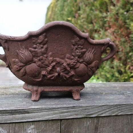 Meget tung støbejern havekrukke i smuk rusten farve fra Frankrig.