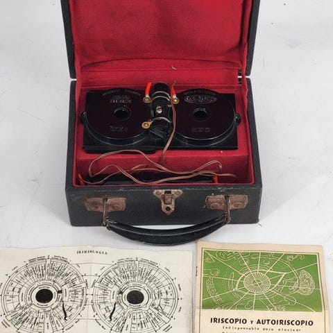 Denne sjældne vintage medicinske enhed er et originalt fransk elektroterapi-sæt fra mellemkrigstiden (ca. 1930'erne), præsenteret i sit bærbare etui med en iøjnefaldende lilla velour indvendig. Det er et smukt og særdeles samlerobjekt af tidligt udstyr til medicinsk elektricitet.