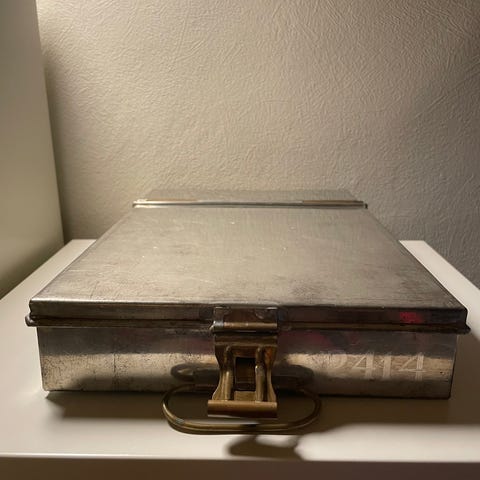 To Lips bankeskriver fra Dordrecht fra 1950-1960 i jern, 14 cm bred, 44 cm dyb, 9 cm høj, i god brugt stand med mindre ældningstegn og mulig korrosion, betjeningslåse med hængsler, lås kan tilsluttes (medfølger ikke). Klik på den blå "gå til varen" knap, for at købe eller byde på denne vare. Den samlede pris vil blive vist inden du afgiver dit bud.