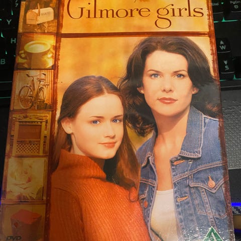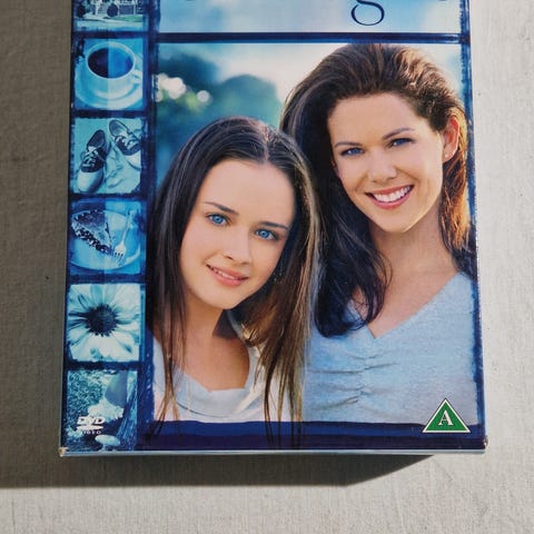 Gilmore Girls dvd-boks. Tv-serie i dvd-format med flere skiver samlet i boks. Omslaget viser serien Gilmore Girls med oplysninger om indhold og tekniske specifikationer på bagsiden. Velegnet til afspilning på dvd-afspillere, der understøtter standard dvd-video.