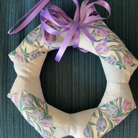 pynt til hjemmet, Krans i tulipan mønster til ophæng syet i patchwork. Måler 18 cm i diameter.