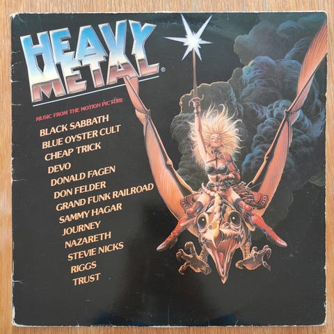 Heavy Metal soundtrack lp i sort cover. Vinylpladen er soundtrack til filmen Heavy Metal og indeholder numre med forskellige kunstnere. Coveret er udført som gatefold med illustrationer og trykt information på indersiderne. Egnet til afspilning på pladespiller, der understøtter lp-format (33 1/3 rpm).