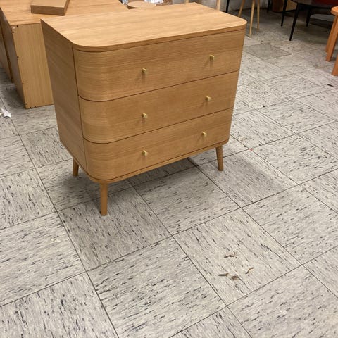 FDB Møblers A87 kommode i lakeret egetræ. Kommoden er i fin stand dog med en lille ridse på den ene skuffe, som vist på billedet. Andre mindre kosmetiske fej kan forekomme.