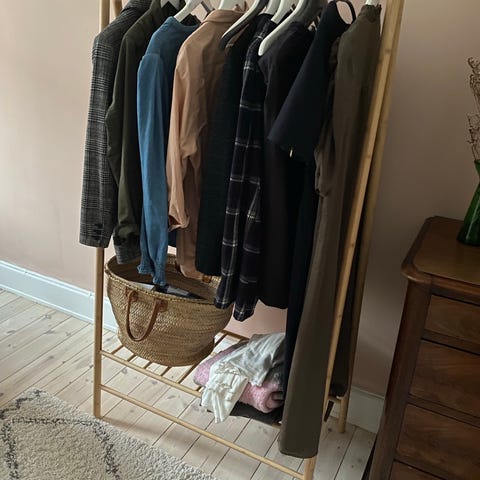 Tøjstativ i bambus. Lille hylde til sko. Kan klappes sammen. Er ikke fra IKEA men oprindelse kendes ikke.