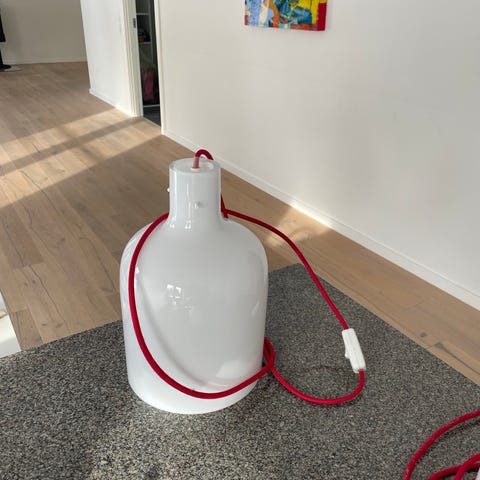 Hvidt glas. Kan både være pendel eller bordlampe. Ledningen lidt slidt, ellers som ny. H=50 cm Diameter 16 cm