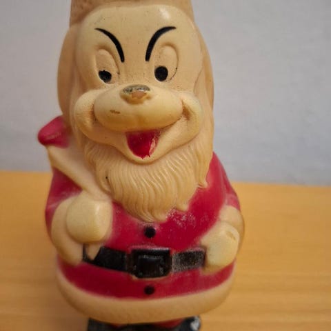 Lille plastikfigur forestillende en gennemsigtig robotlignende skikkelse med flere ben og rørformede arme. Øverst sidder en mindre blå figur med rød maske og gul detalje på hovedet. Figuren er ca. 4 cm høj, som vist ved siden af en lineal. Egnet som samlerfigur, legetøj eller pynt på hylde eller skrivebord.