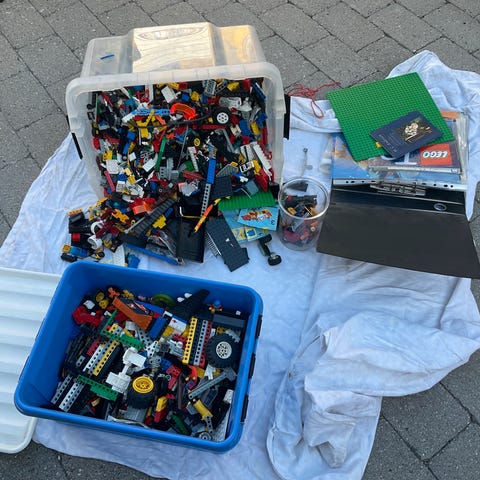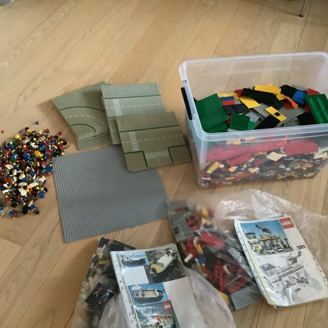 Gamle LEGO træklodser med bogstaver, tal samt enkelte dyremotiver trykt på siderne. Klodserne leveres i oprindelig rød trææske (brugsspor). 18 klodser.
