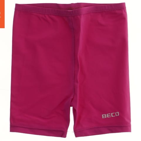 Badebukser til små børn med en rød og lyserød farve. Bukserne har illustreret motiv af forskellige havdyr som fisk, hvaler og krabber. De er designet til at være behagelige og sikre under vandaktiviteter.