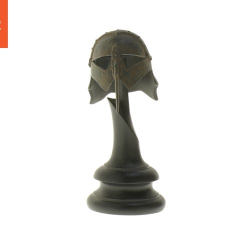 En detaljrig model af Rohirrim-hjelmen fra Merry fra 'The Lord of the Rings: The Return of the King'. Denne collectible hjelm er i skala 1/4 og står på en sort base. Hjelmen er dekoreret med skinnende sølv- og guldtoner samt brunlige detaljer, der fremhæver det intrikate mønster. Det er en fantastisk tilføjelse til 'The Lord of the Rings' samlinger. Tags: collectable, lordoftherings, hjelm, rohirrim.