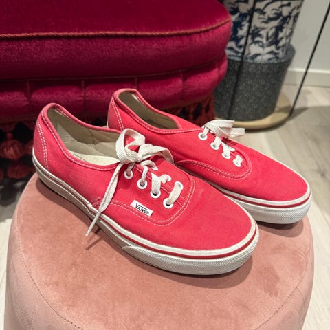 Et par røde Vans højtop sneakers i størrelse 36. Skoene har hvide snørebånd og en karakteristisk hvid stribe langs siden. Sålen har et skakbræt mønster rundt om kanten. Der er synlige tegn på brug på skoene, såsom lidt slitage på sålen og let misfarvning.
