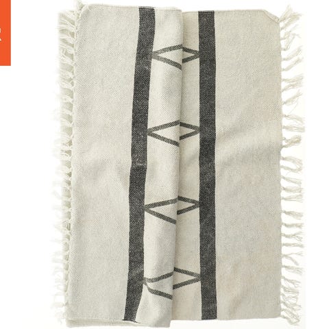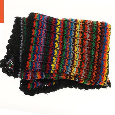 Dette tæppe har et farverigt mønster med forskellige striber, der inkluderer nuancer af rød, blå, grøn, og orange. Det er rektangulært og måler 116x120 cm. Materialet ser ud til at være strikket eller hæklet, hvilket giver en varm og hyggelig tekstur.