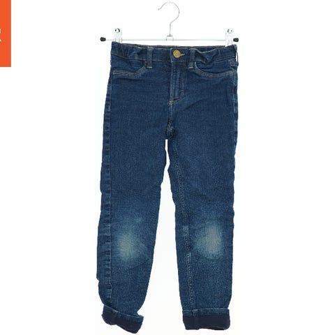 Et par børnejeans med foer i blå denim med to forlommer og to baglommer. Bukserne er designet med et enkelt knap og lynlåslukning foran. De nederste opslag har et blomsterprint, der giver et dekorativt touch. Stoffet ser ud til at være let falmet for en stilfuld slidt look.indvendigt har jeansene bomuldsfoer med blomster mønster.