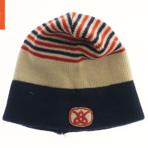 Denne hue er lavet af gul strikstof og har en hvid pelskvast på toppen. Huen er rund og har en diameter på 20 cm. Et mærke på indersiden angiver, at produktet er fra brandet Pieces. Huen er designet til at holde hovedet varmt i kolde vejrforhold.