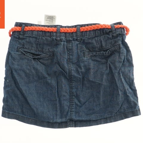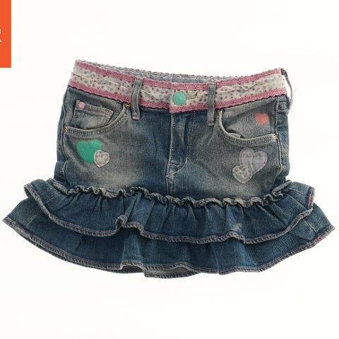 Denim nederdel med flæser. Foran er der to lommer med detaljer. Taljebåndet har farverigt broderi med teksten 'Peace Love Hello Kitty'. Der er to baglommer, hvoraf den ene har et stenmotiv af en kat.