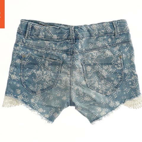 Lyseblå denim shorts med elastisk talje og snørebånd. To skrå lommer foran og to påsyede lommer bagpå. Opsmøgede benkanter.