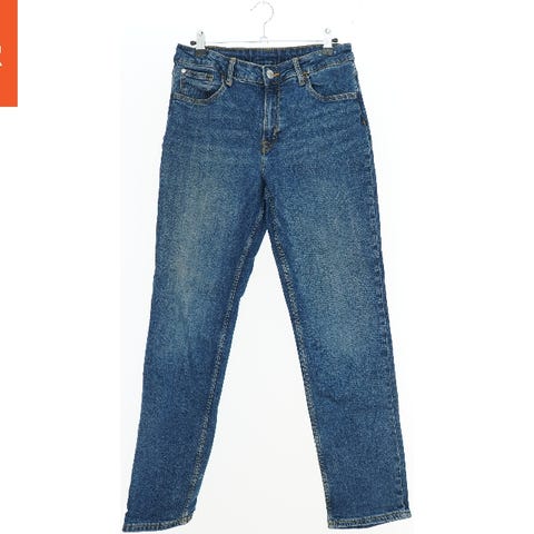 Par jeans i lys blå farve med let slid detaljer foran. De har lommer både foran og bagpå og er lukket med lynlås og knap. Helt nye med prismærke