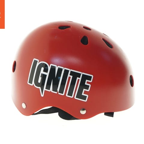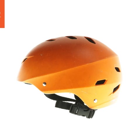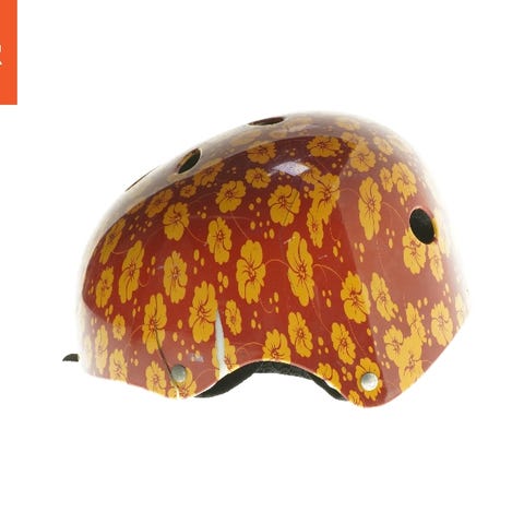 En orange cykelhjelm med Tweety-motiv og blomstermønster. Den har ventilationshuller og kommer med ekstra beskyttelse til indersiden. Hjelmen er designet til at passe en hovedstørrelse på Ø 48-54 cm.