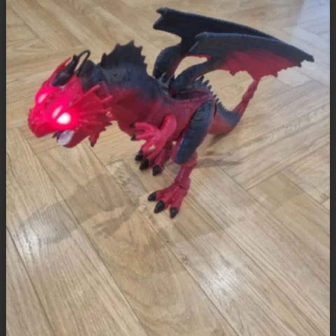 Objektet er en udførligt designet hovedbeklædning, formet som hovedet af en drage med skinnende gyldne horn og skarpe tænder. Den er primært orange med sorte prikker, der giver et skællet udseende. Hovedbeklædningen måler Ø 18 cm og har detaljerede vinger og øjne. Den er lavet af bløde materialer og har en åben underside til at passe på hovedet.