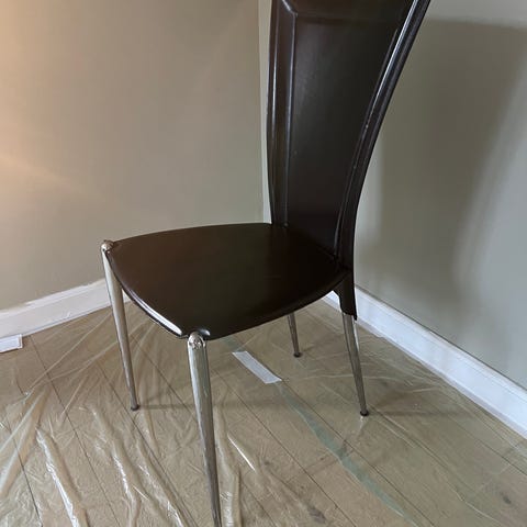 8 Ilva spisebordsstole i formspændt træ med synlig træstruktur og slanke metalben. Siddehøjden er 46 cm. De fleste stole har nogle skrammer/ ridser i træoverfladen. 50 kr per stol, 300 kr for alle 8.