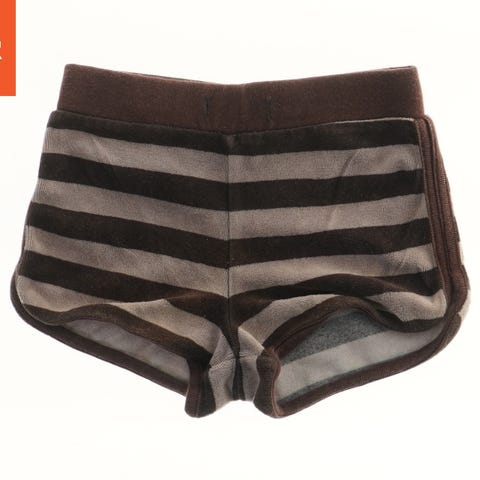 Bukser med striber i lilla og orange farver. De har elastik i taljen og er lavet af et blødt materiale. Designet inkluderer to sidelommer.
