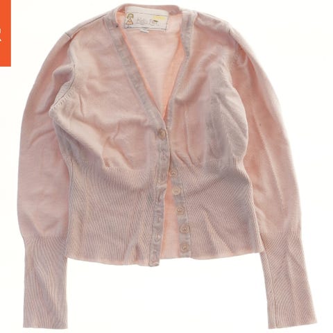 En lilla cardigan med lange ærmer og en række knapper foran. Den har en v-udskæring og ribkanter omkring taljen og håndleddene.