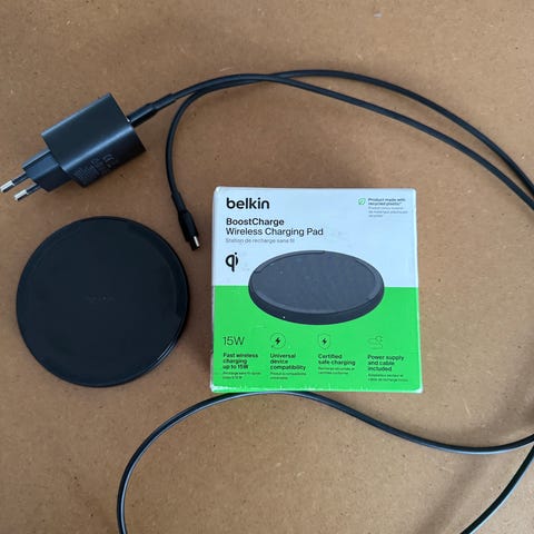 Belkin Boost Up trådløs oplader med en effekt på 10W. Opladeren er rund og i sort farve. Understøtter trådløs opladning af kompatible smartphones via Qi-standard. Leveres med tilslutningskabel til strømforsyning, afhængigt af hvad der følger med den konkrete pakke. Velegnet til daglig opladning af Qi-kompatible telefoner på skrivebord, natbord eller andre flade overflader.