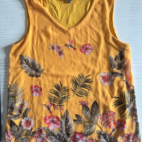 Upside velourbluse S. NY. Mellemkraftig brun velour med vævet snirkel mønster, korte ærmer. 100% polyester. Bryst 92cm. Længde 65cm. Vejer 184g.