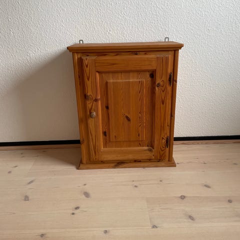 Vægskab i massiv fyrtræ med 2 låger og med 2 flytbare hylder og med beslag til ophæng.