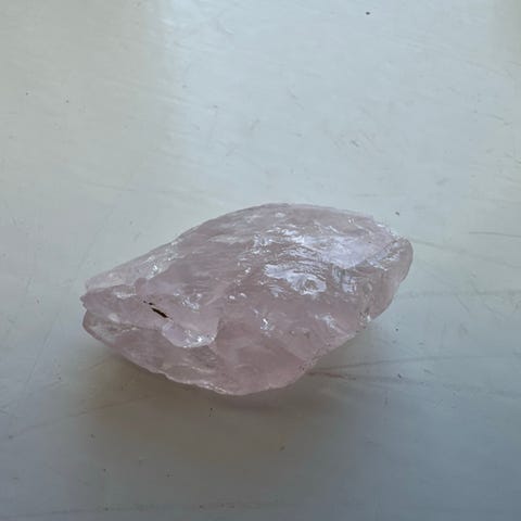 Rosenkvarts poleret sten i lyserød farve. Stenen er afrundet og glat og måler cirka 3 cm i længden, som vist på billedet med målebånd. Velegnet som lommesten, dekoration eller til brug i smykkefremstilling og andre kreative projekter. Vægt: 7 gram.