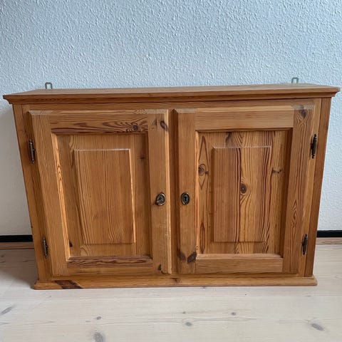 Vægskab i massiv fyrretræ med en låge og 2 flytbare hylder og med beslag til ophæng sælges billigt pga. Flytning og må afhentes hurtigst muligt i Nykøbing Falster.