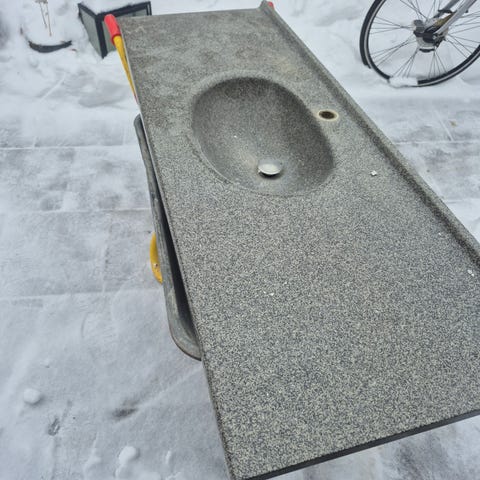 Badeværelsesbordplade i Carrara marmor/lys marmor med vask . Vasken er underlimet og kan udskiftes til anden vask såfremt det ønskes. Bordpladen er med hul til armatur og har kalkaflejringer.