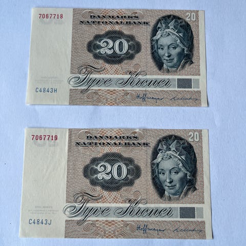 2 stk flotte 20 kr sedler 1981 i numre orden.