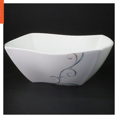 Et sæt bestående af tre porcelænsfade og skåle. Sættet inkluderer en dyb skål, et medium størrelse fad, og et stort serveringsfad. Dimensionerne er henholdsvis 16 cm, 25 cm, og 29 cm. Fyrklöveren Victoria kombinerer bølgende former, diskrete farver og smukke gulddetaljer. Det sarte, snoede mønster i blå, grå og guld er designet af Anne Rooslien som en hyldest til kærligheden. Lavet af porcelæn af højeste kvalitet - holdbart, tåler opvaskemaskine og perfekt til en luksuriøs borddækning, igen og igen! En fremragende bryllupsgave eller housewarming-gave.