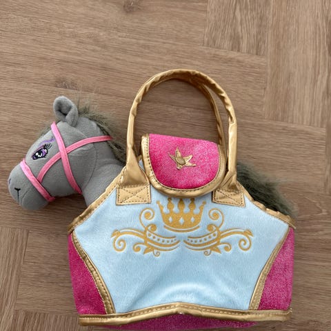 En plys hest med en blød og fluffy manke og hale. Hesten er 40x35 cm i størrelse og lavet af blødt materiale. Den har detaljer som hvide fødder og sort hestesko. Denne plys hest er egnet som både legetøj og dekoration.
