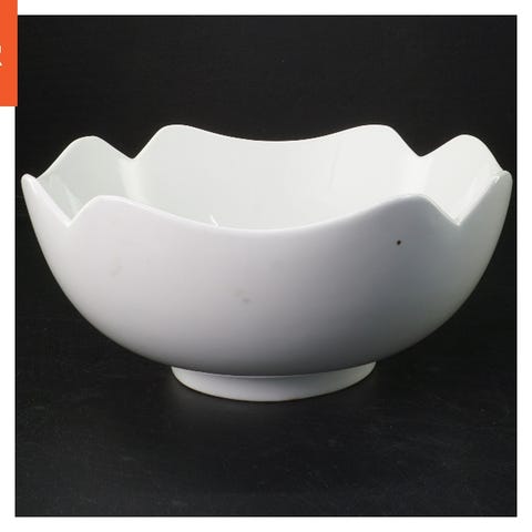 Denne skål er fremstillet af hvidt porcelæn og har en dekorativ guldkant med mønster. Den måler 9 cm i diameter og 3 cm i højden. Skålen er velegnet til at stå fremme som en dekorativ genstand eller til at opbevare småting.