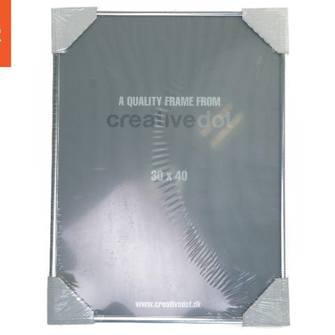 En billedramme med dimensionerne 43x33 cm. Den har en sort kant og er designet til at holde et enkelt billede eller kunstværk. Bagsiden af rammen indeholder vedhæftninger til ophængning på væggen.