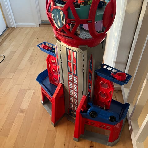 Legesæt fra Paw Patrol, inklusiv en observtionspost med orange tag og grå rutschebane. Sættet inkluderer også en række små figurer i forskellige farver og hundetemaede tilbehør. Medfølgende er også små køretøjer og forskellige elementer som en brandhane og skjold.