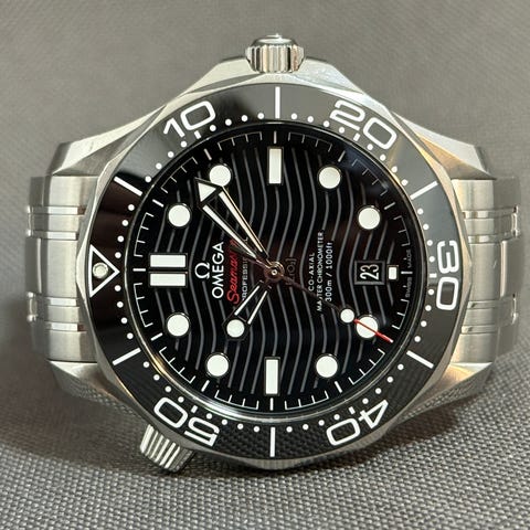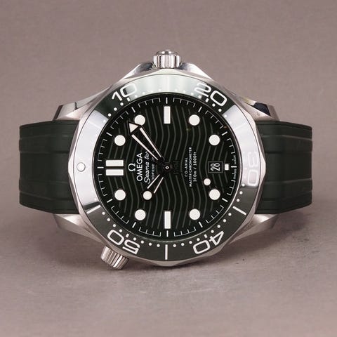 Den populære Omega Seamaster 300 M med sort skive og sort keramisk krans. Bag den gennemsigtige safir bagkasse, kan man se det flotte automatiske, Master Chronometer Calibre 8800, som yder 55 timers gangreserve og vandtæthed ned til 300 meter.