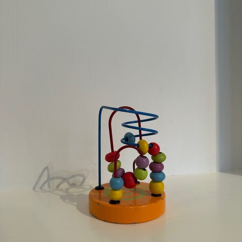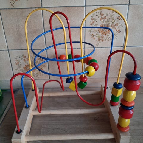 Dette er en farverig labyrint kuglebane, der består af forskellige farvede trækugler trædet på metalstænger med en grøn cirkulær base. Stængerne er formet i forskelligartede buer, der tillader kuglerne at glide langs dem. Legetøjet måler 12 cm i højden og er beregnet til at stimulere børn ved at udvikle deres finmotoriske færdigheder og hånd-øje-koordination.