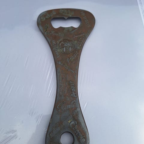 Dette er en vintage flaskeåbner lavet af metal. Flaskeåbneren har en stilfuld og klassisk design med en længde på 11,5 cm. Den primære funktion er at åbne flasker, og den har en ring i toppen til ophæng. Flaskeåbneren har en robust konstruktion, og designet fremstår med indviklede mønstre og udsmykninger, hvilket gør den også velegnet til samlere og retro-entusiaster.