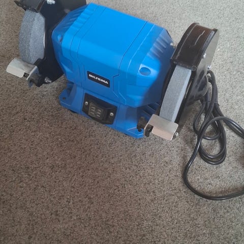 Dette er en elektrisk slibemaskine med en størrelse på 14x15,5 cm. Den har en grøn farve og er udstyret med en lang sort ledning. Maskinen ser ud til at have en robust konstruktion og er velegnet til forskellige slibeopgaver.